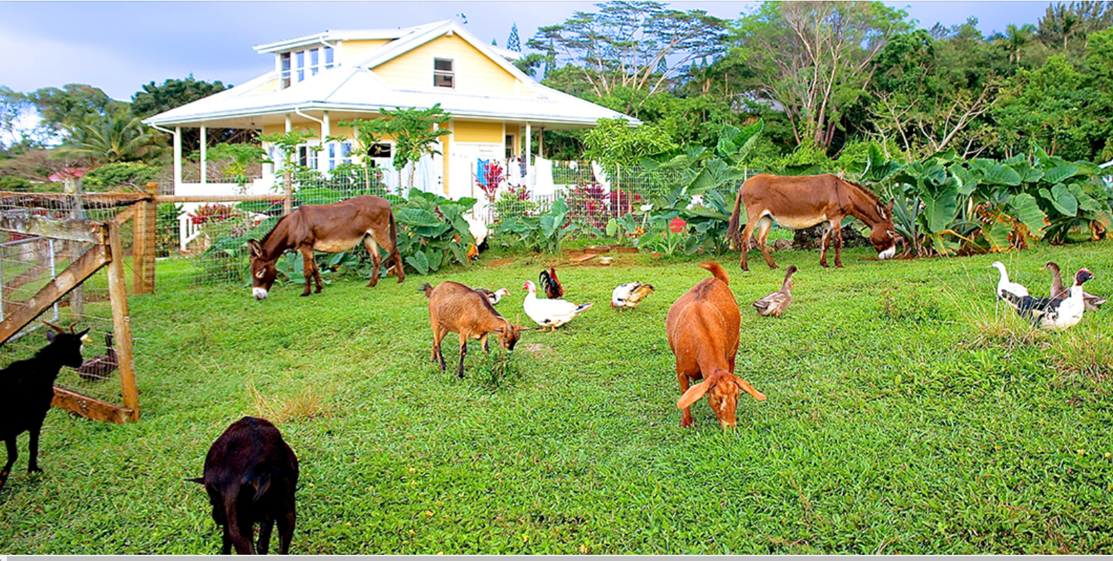 According to the Leilani Farm Sanctuary website, when you take one of the tours offered three times a week, here’s what you may encounter: “A gentle cow munches contentedly in a shaded corner of rolling green pasture overlooking the sparkling Pacific. Goats frolic, deer bask in the warm sun, pigs roll happily in the mud, and a pair of inseparable donkeys anticipate sweet nibbles of carrots and apples. Friendly chickens cluck and turkeys gobble, while ducks and geese splash in ponds. Rabbits and guinea pigs scamper through cool gardens.